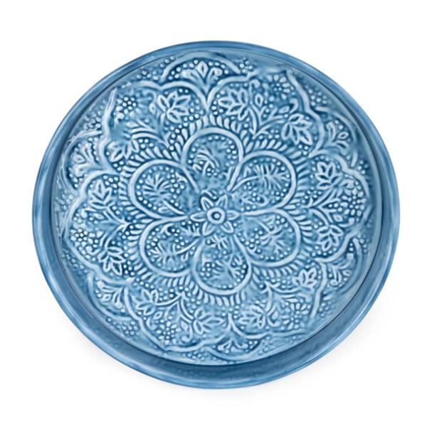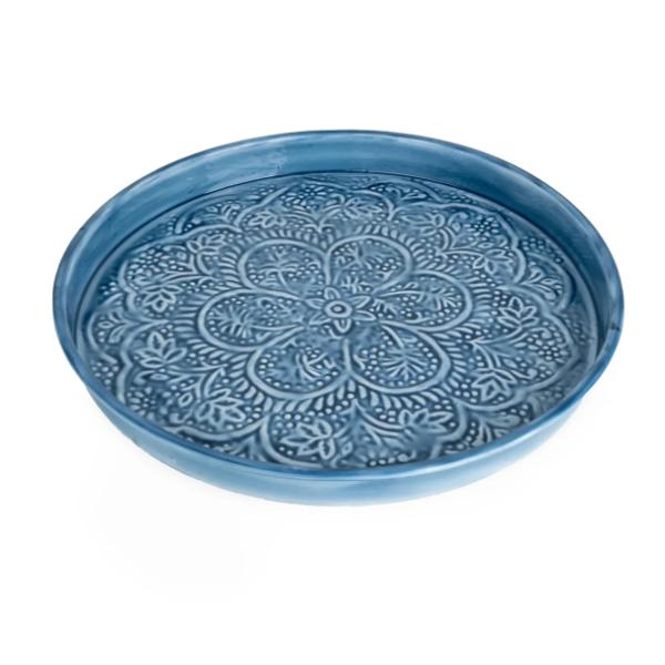 Crafted with meticulous attention to detail, this 32cm Round Metal Tray showcases an exquisite embossed enamel design in a fresh, vibrant shade of blue, evoking the essence of intricate mandala patterns. Perfect for both decorative and practical use, this tray can serve as a stunning centrepiece on your dining table or an elegant accessory for displaying candles or small items. The beautiful enamel finish not only enhances its visual appeal but also adds a touch of gloss that complements its textured, ornamental surface. Available in a convenient pack of four, these plates are ideal for harmonizing the décor in any space, blending classic artistry with modern versatility.