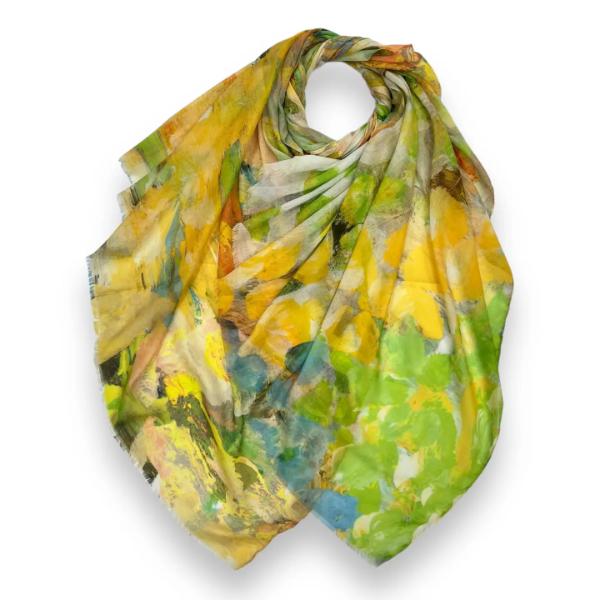 Abstract tulip scarf with bright colours, finished with fringes on each end Composition: 20% Cotton, 80% Viscose Measurement: 180cm x 85cm