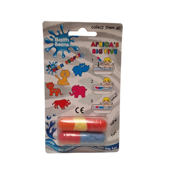 From Africa to the world, an adventure awaits in the form of the Africa’s Big Five Bath Beans! Go on a game viewing tour in the comfort of your bathtub and discover the thrilling quest of watching the Big 5 sponge characters emerge! Each Bath Bean blister packet contains 2 Bath Beans with 5 cute sponge characters.