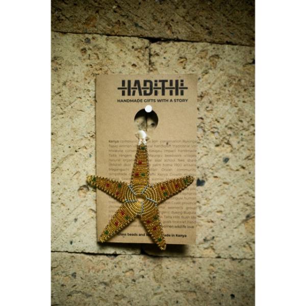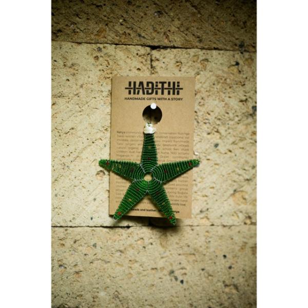 Glass beads and metal wire. Star 4 inches diameter. Green