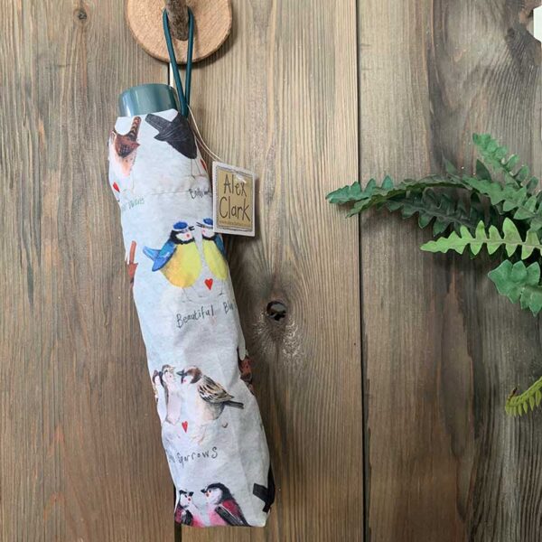 A colourful three folding umbrella perfect for carrying around in your bag. Featuring the Brilliant Birds artwork design, including various garden birds – blue tits, sparrows and wrens.