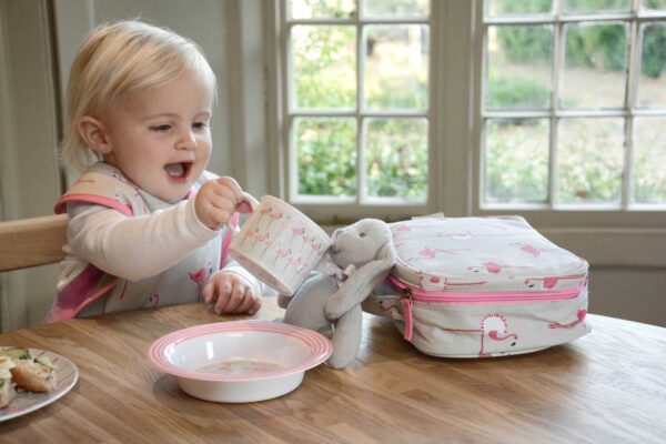 Make feeding time fun and playful with this practical bib in our pink Flamingos design. Suitable for babies and toddlers from 6 months old.