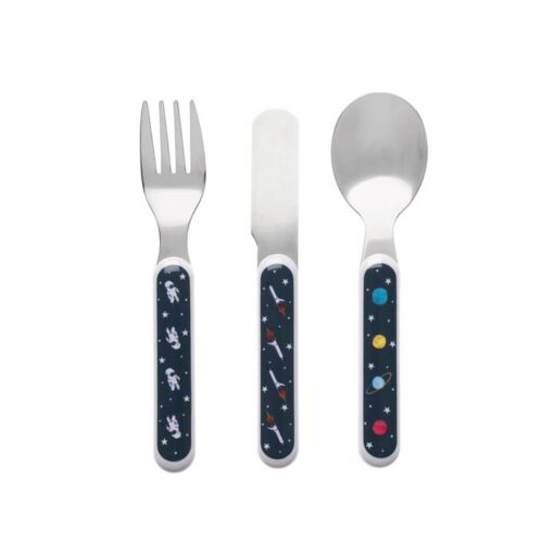 This fun cutlery set contains a fork, knife and spoon dotted with Sophie’s illustrations of astronauts, rockets and planets.