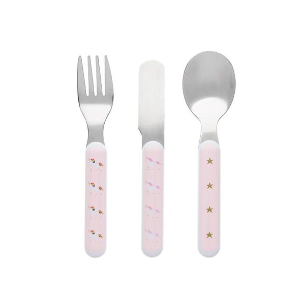 Graceful unicorns stand proudly on the handles of this melamine cutlery set, bound to be loved by any young unicorn fan! Easy for little hands to hold, the set includes a knife, fork and spoon in a gift box.