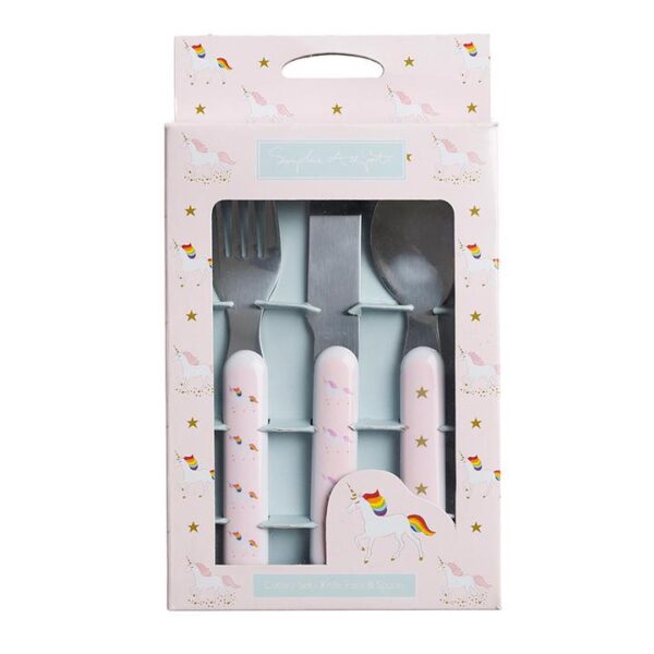 Graceful unicorns stand proudly on the handles of this melamine cutlery set, bound to be loved by any young unicorn fan! Easy for little hands to hold, the set includes a knife, fork and spoon in a gift box.