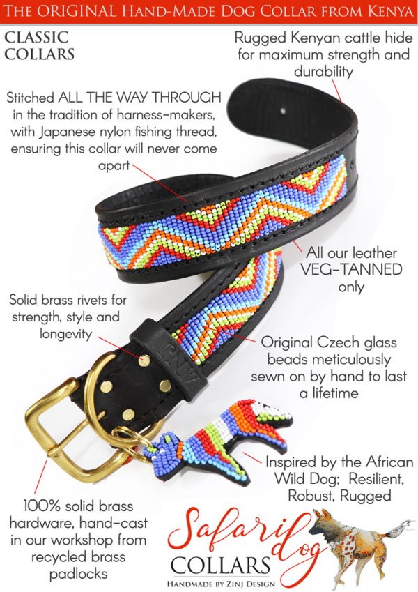 Made from hard-wearing, Kenyan beef leather and lined with a soft, goat-skin lining. 100% glass beads, and solid brass hardware. Hand-stitched to uphold our ‘lifetime’ guarantee.