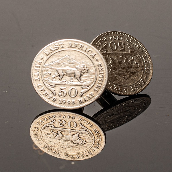 Old British East African 50 cent coin cufflinks featuring Mt. Kenya in the background