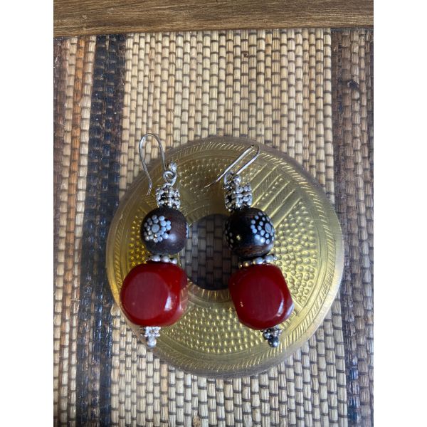 Red ‘African Amber’, Antique Black Coral and silver Tut Beads with Sterling silver hooks