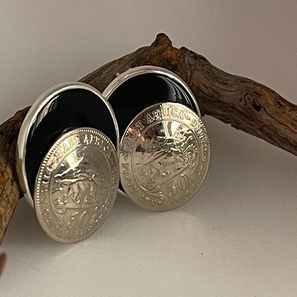Black” African Amber disc featuring Old British East African 50 cent coin with Mt.