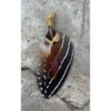 Large patterned gold cone bead with carnelian stone, and a yellow pheasant feather over a long black and white spotted guinea fowl feather