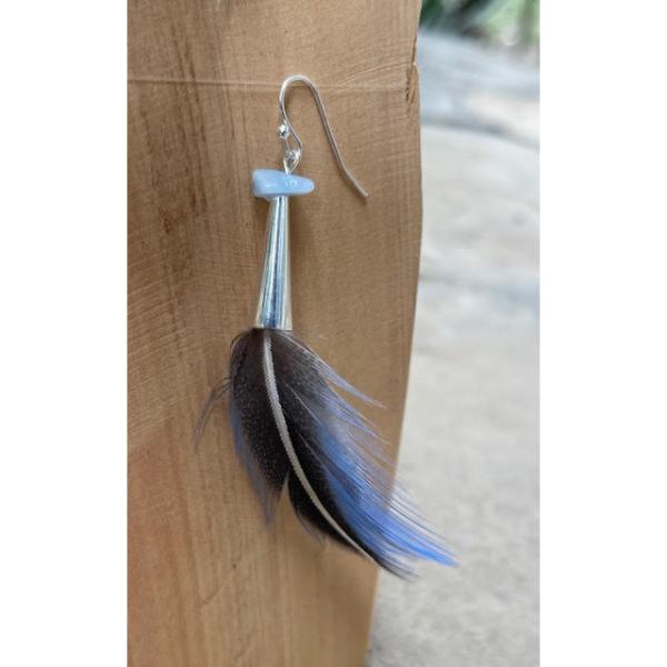Long silver cone earring with aquamarine stone, and a black and white stripped and bright blue vulturine guinea fowl feathers