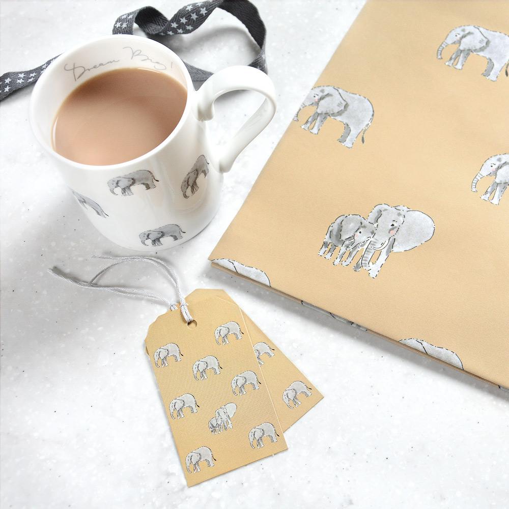 Gift adorable looking presents wrapped in this quality mustard coloured gift wrap, covered in smiling African elephants. This quality gift wrap is printed using vegetable based inks and is made from 120gsm thick matt paper. Each sheet is 50 x 70cm.