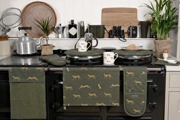 A practical kitchen gauntlet, covered in stunning cheetahs on a forest green background. A lovely gift for wildlife lovers – particularly those who are AGA owners, too.
