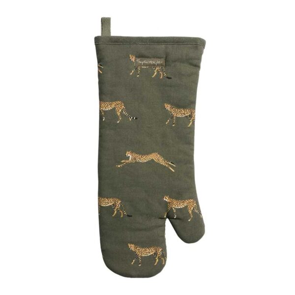 A practical kitchen gauntlet, covered in stunning cheetahs on a forest green background. A lovely gift for wildlife lovers – particularly those who are AGA owners, too.