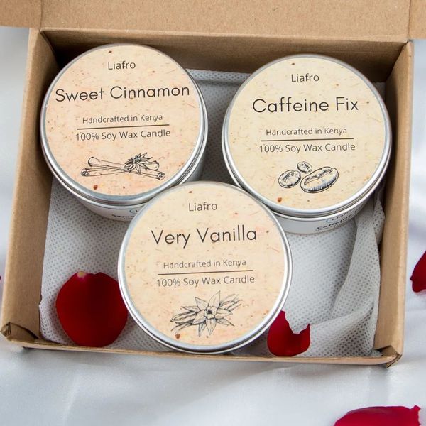 The LOVE GIFT BOX contains 3 soy wax candles: Very Vanilla, Sweet Cinnamon & Caffeine Fix.