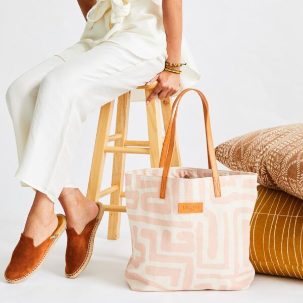 Say hello to your new everyday bag! The Go-To tote is perfect for heading out to work or for a weekend stroll to the farmers market. The leather straps fit comfortably over your shoulder, making it easy to transition from Summer to Fall. You will make your entrance into any room with our bold, hand screen printed Kuba print.