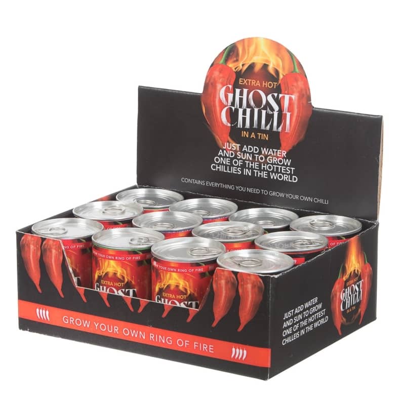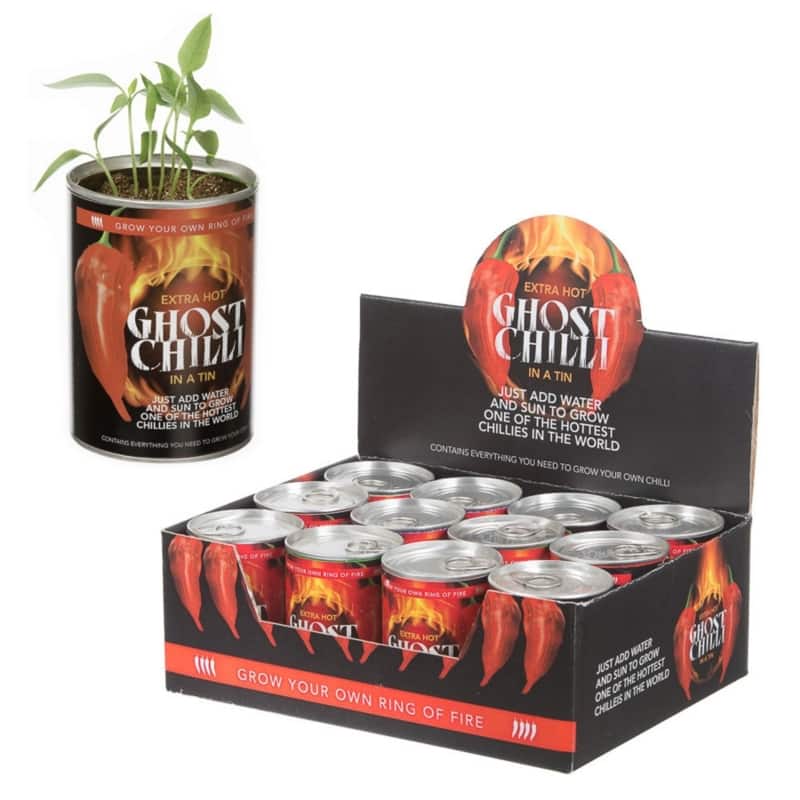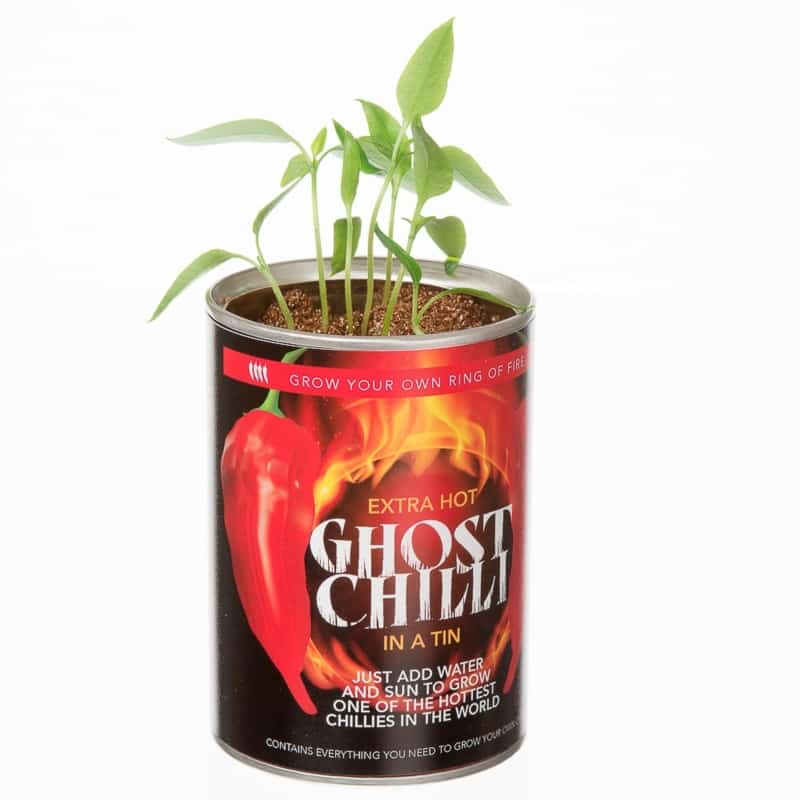 Growing your own chillies could not be any easier. Each tin contains everything you need to grow your own chilli plant. Just pop the lid on the can, put the seeds under the ‘soil’ and water them gently. Leave the tin in direct sunlight and in a couple of months you’ll be harvesting your own crop of extremely hot chillies. The Ghost Chilli, from the state of Assam in India, remains one of the most potent chillies on the planet and guaranteed to make your mouth (and eyes) water.