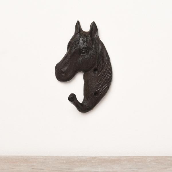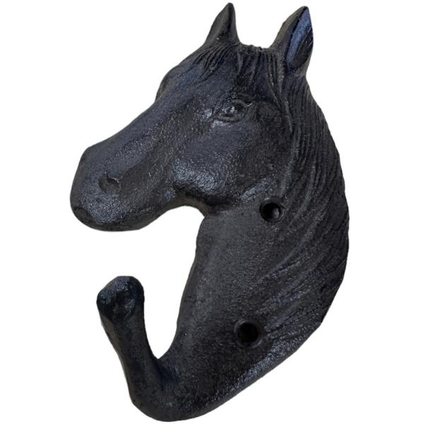 A black cast iron hook with a horse design. Great for holding horse tack and head collars.