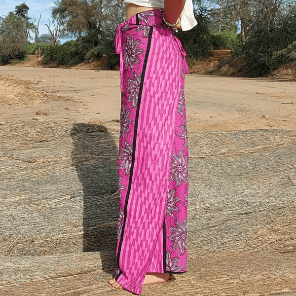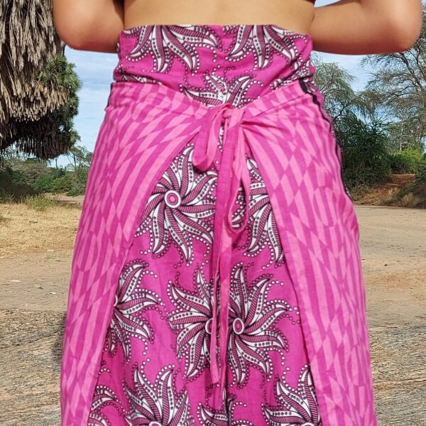 Embrace Kenyan elegance with vibrant kanga wrap-style trousers. Crafted from authentic Kanga fabric, they blend comfort and culture seamlessly, adding flair to your wardrobe.