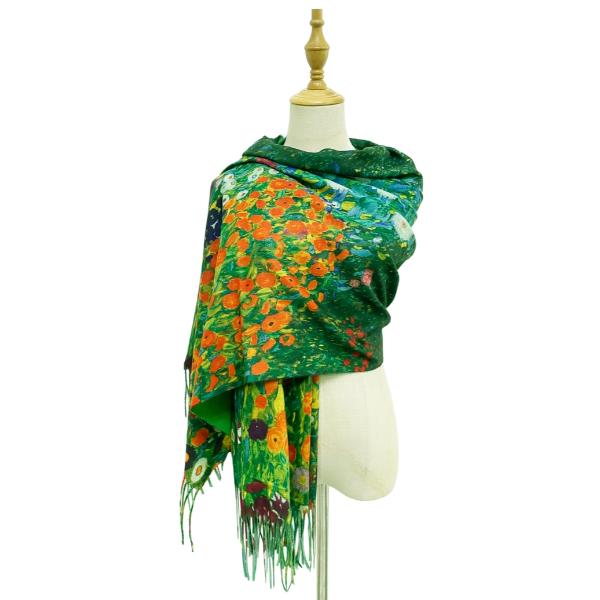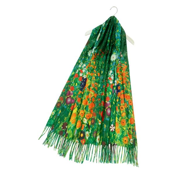 This wool mix scarf features a beautiful print of Klimt’s iconic painting, ‘Flower Garden’. The striking print is complemented by a fringe of tassels along the hem, adding texture and movement to the piece. This scarf is sure to make a statement, elevating any look with its vibrant colours and romantic floral pattern.