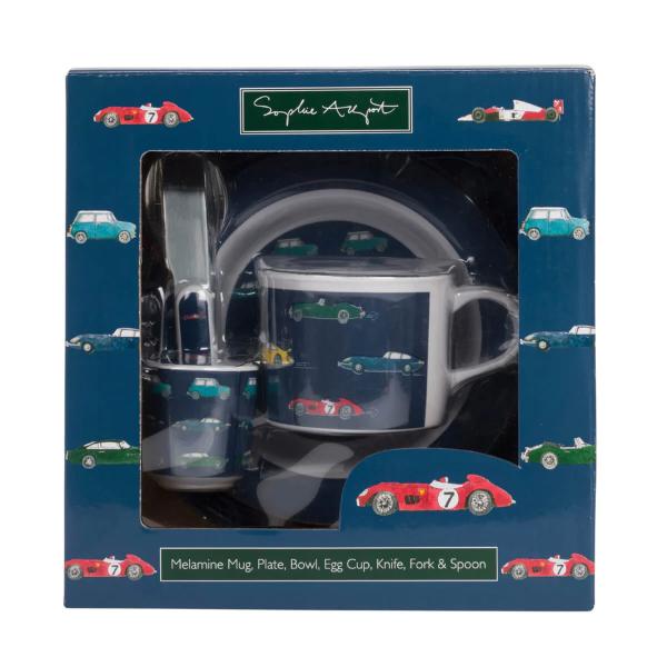 This Car themed seven-piece dining set includes a plate, bowl, cup, knife, fork, spoon and egg cup. A practical little gift set for children’s birthdays and christenings. This brilliant set features Sophie’s illustrations of lots of classic and fun cars on a navy ground! Perfect for children who love cars!