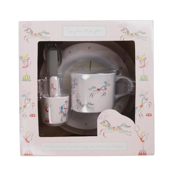 This Fairground Ponies themed seven-piece dining set includes a plate, bowl, cup, knife, fork, spoon and egg cup. A lovely little gift set for children’s birthdays and christenings. This cute set features fairground ponies and acrobats on a sweet pink background.Â