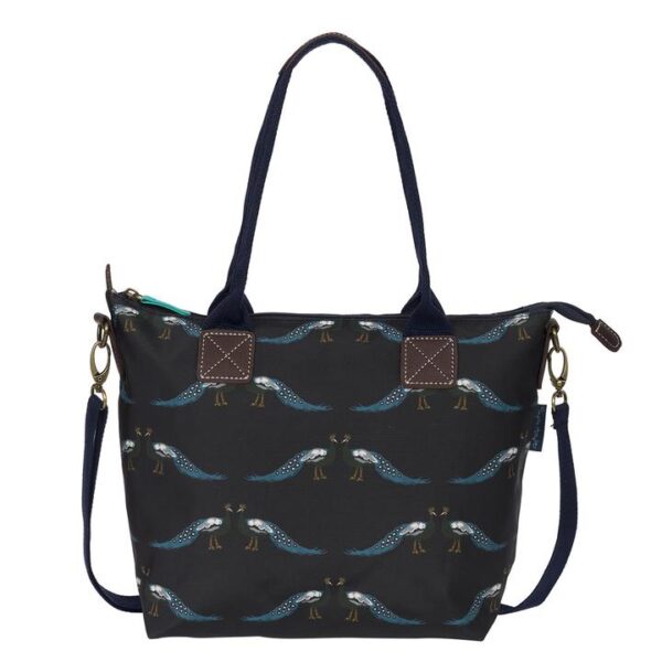 Made from showerproof oilcloth, this midnight blue mini Oundle bag features Sophie’s sophisticated illustrations of marvellously coloured peacocks. It has plenty of pockets and a handy shoulder strap to use when your hands are full.