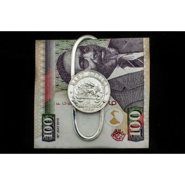 Brass silver-plated money clip featuring 1921 old British E. Africa coin celebrating 100 years of Kenya (comes with 100 shilling note & handmade leather box)