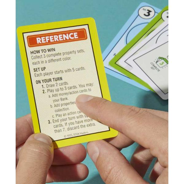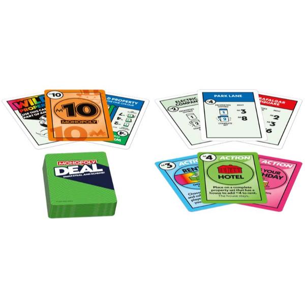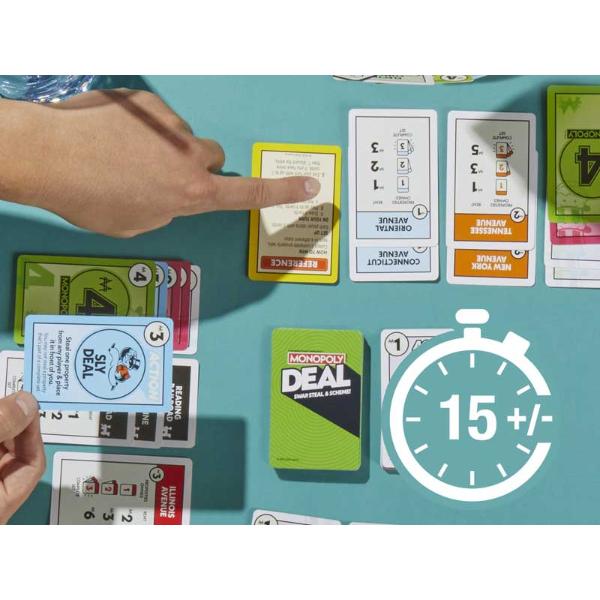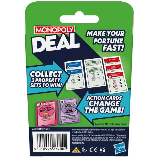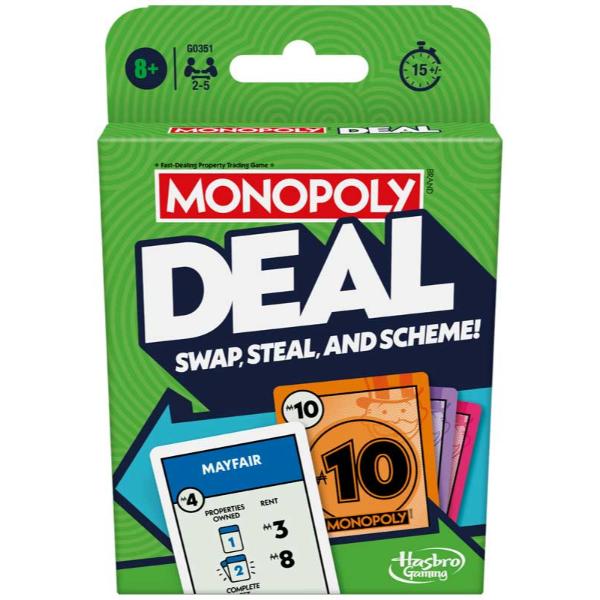 Swap, steal and scheme with the Monopoly Deal card game! Be the first player to collect three complete Property card sets, each in a different colour, to win. This deck includes 110 cards: Property cards, Wild Property cards, Action cards and Money cards. Wild Property cards help players build Property sets. Action cards mix up the game by letting players collect rent, steal and swap properties, and more. And players pay their debts with Money cards. Easy to play and set up, this card game for ages 8 and up can be played in as little as 15 minutes! Whether you’re searching for fun games for children and adults, family games or kids travel games, it’s a great pick for playing at any time. The Hasbro Gaming, Parker Brothers and Monopoly names and logos, the distinctive design of the gameboard, the four corner squares, the Mr. Monopoly name and character, as well as each of the distinctive elements of the board and playing pieces are trademarks of Hasbro for its property trading game and game equipment.