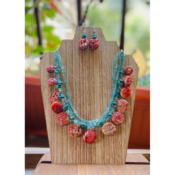 Necklace featuring Orange Rhyolite beads with tumbled Turquiose from Arizona with turquoise chips, matching earrings