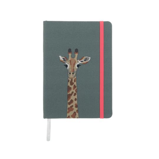 This B6 notebook features an elegant giraffe which contrasts beautifully against the woody green coloured background and coral elastic strap. This small notebook is handy for keeping in your bag, writing shopping lists and using for work or school.