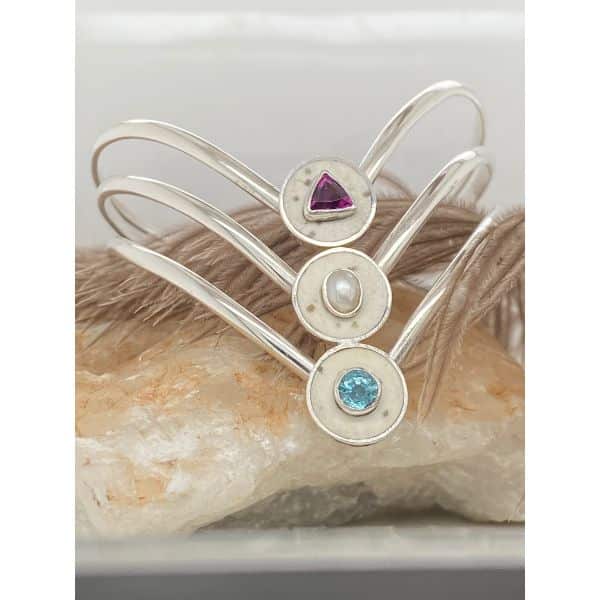 Sterling silver 3 layer cuff featuring Purple garnet, pearl, blue zircon set in Ostrich Eggshell