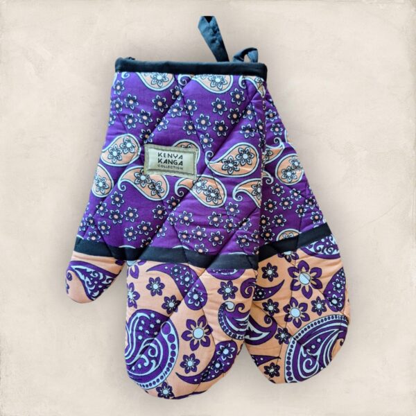 Protect your hands from heat with these durable oven mitts. They have a unique floral pattern inspired by the traditional African fabric. They are crafted for comfort and safety, providing a secure grip.
