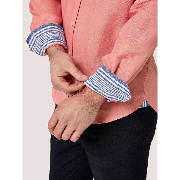 The soft salmon hue brings warmth and confidence, while our signature Kenyan blue and white striped Kikoy fabric adds a distinctive twist. Hidden inside the collar stand, cuffs and side gussets, the detail reveals itself as you move, bringing personality to a timeless classic.