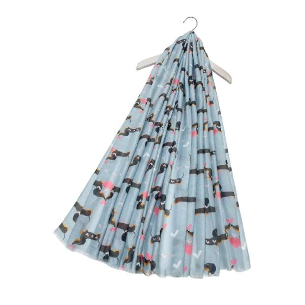 * Size: 70 x 180cm (Approximately) * Material: 100% Viscose * Cute Sausage Dogs and Scattered Love Hearts Print * Frayed Edge * Perfect for Sausage Dog / Animal Lovers