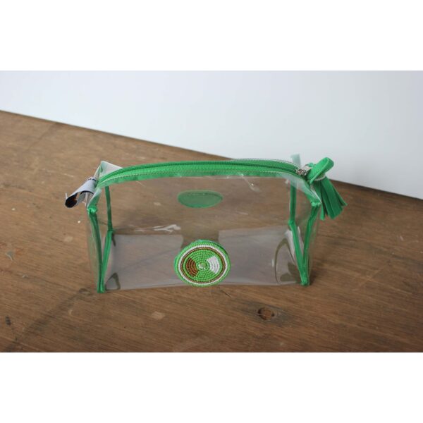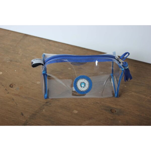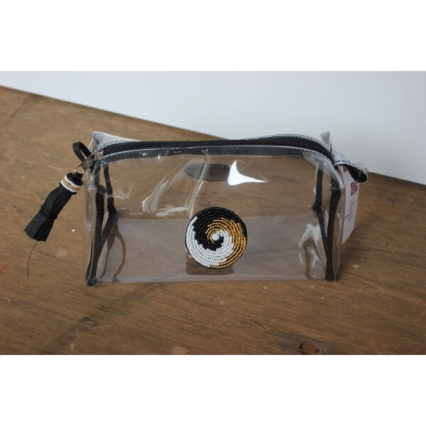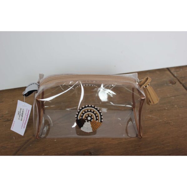 Delicately designed yet remarkably durable in hand beaded medallion on each side, the small clear trapeze bag is designed to keep your cosmetics and other small necessities really organized at home, on the road or getting through airport security. Finished off with a beaded tassel.