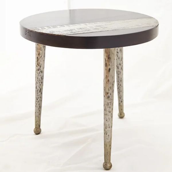 “Less is more” Clean lines for this modern table with mahogany top fused engraved metal design feature and three metal legs.