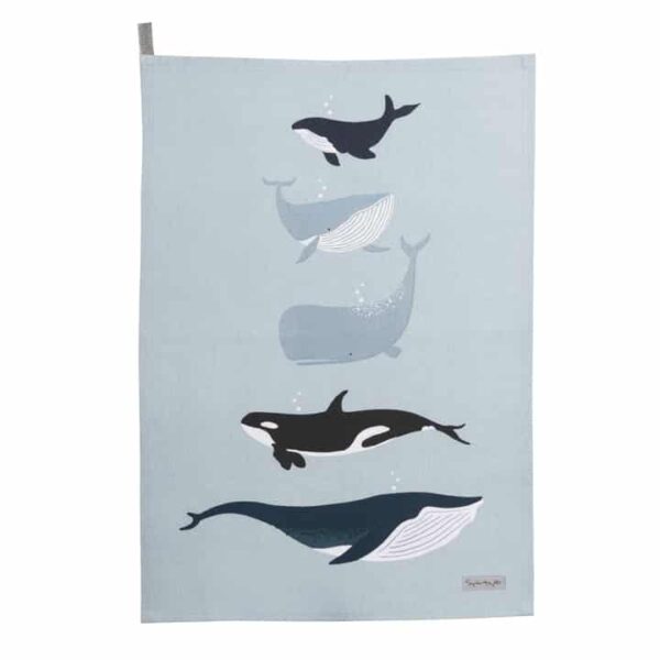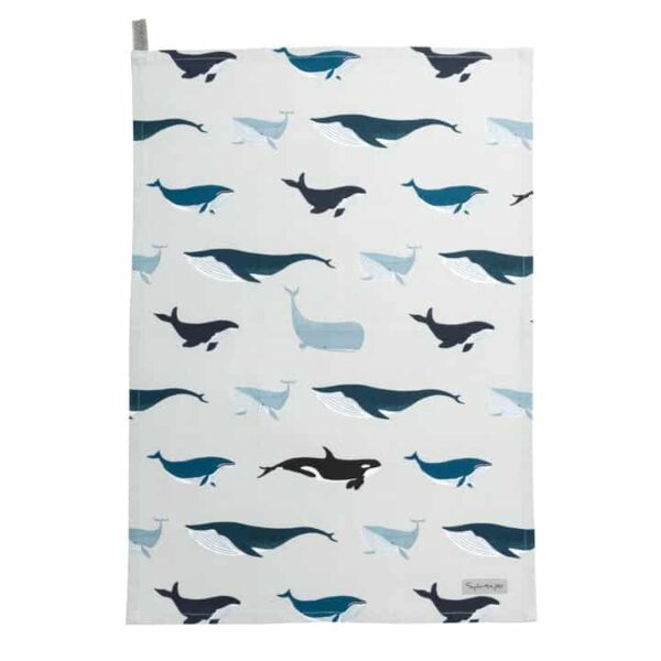A pair of practical cotton tea towels in Sophie Allport’s beautiful whales design. The first features her Whales Statement Tea Towel which has five illustrated whales on a cool blue background, while the other features a variety of magnificent whales on a cool grey background. There is a handy ‘loop’ on each top left corner so you can hang them up in your kitchen.