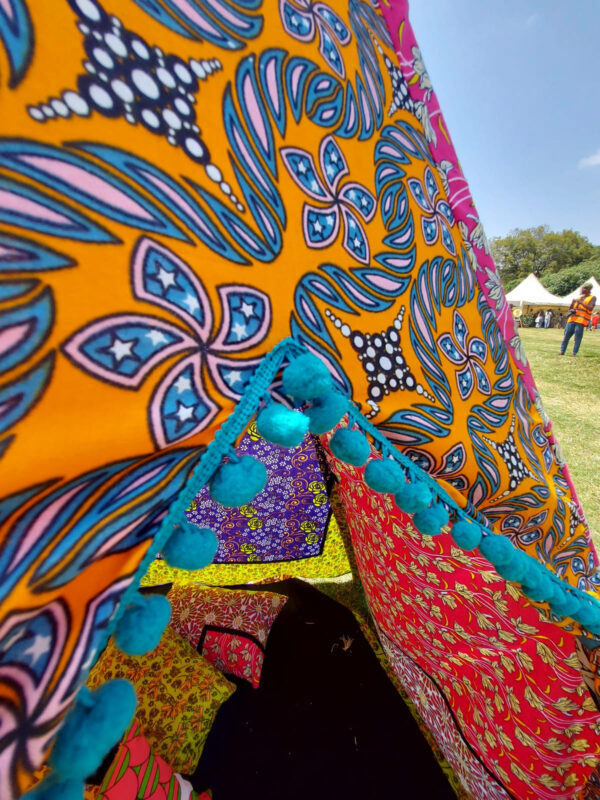 A kanga teepee for kids is a fun and colorful play tent that is made from kanga fabric, a traditional cotton cloth from East Africa. Kanga fabric has various patterns and colors, each with a unique Swahili proverb printed on it. A kanga teepee for kids can be a cozy and creative space for children to enjoy indoors or outdoors.