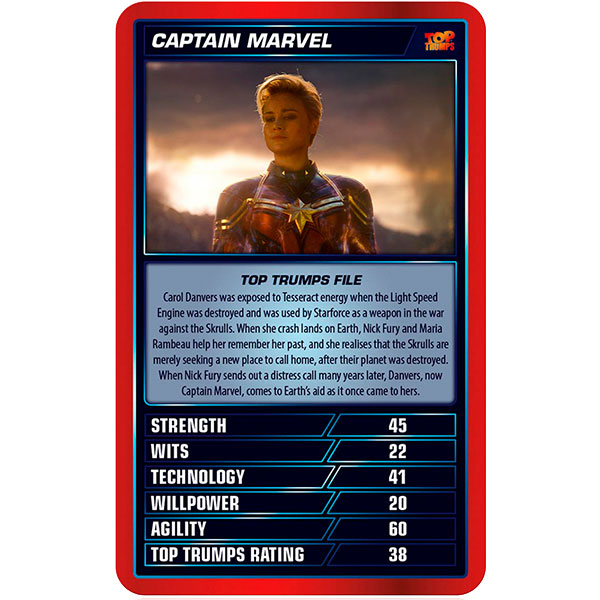 The Marvel Cinematic Universe is one of the most thrilling, intricate and sprawling franchises in movie history, featuring a plethora of inspirational superheroes from across the globe. We’ve hand-picked thirty of our favourite heroes and villains and pitted them against each other in this brand new edition of Top Trumps: Marvel Cinematic Universe. With stars like Black Widow and Star-Lord, Doctor Strange, Shuri and Black Panther, plus villains like Thanos, War Machine and Loki, choose from categories including strength, technology and wisecracks and battle to see which of these superpowered icons is the greatest! Each card features a unique bio and official artwork, and combined with the classic competitive gameplay that Top Trumps is known for, this pack is guaranteed to please film fanatics and players alike. Stark technology won’t win this battle for you – you’ll need to rely on your skills and your knowledge of the MCU to succeed!