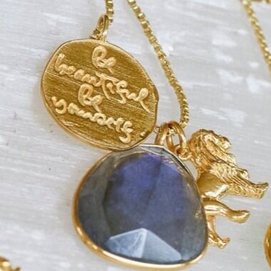 Be Beautiful, Be Yourself pendant, with large labradorite and charming lion pendant. A lovely statement piece, with the rather brave lion to bring the wearer courage.