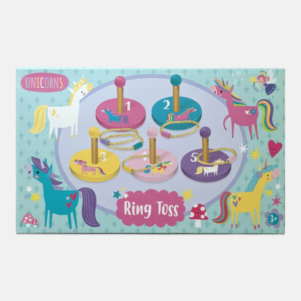 Enjoy some garden fun with family and friends with this traditional game of quoits, beautifully illustrated with Unicorn artwork. Includes – 5 peg hardwood cross base target, 5 rope tossing rings and instructions. Box Dimensions: 115 x 427 x 55mm