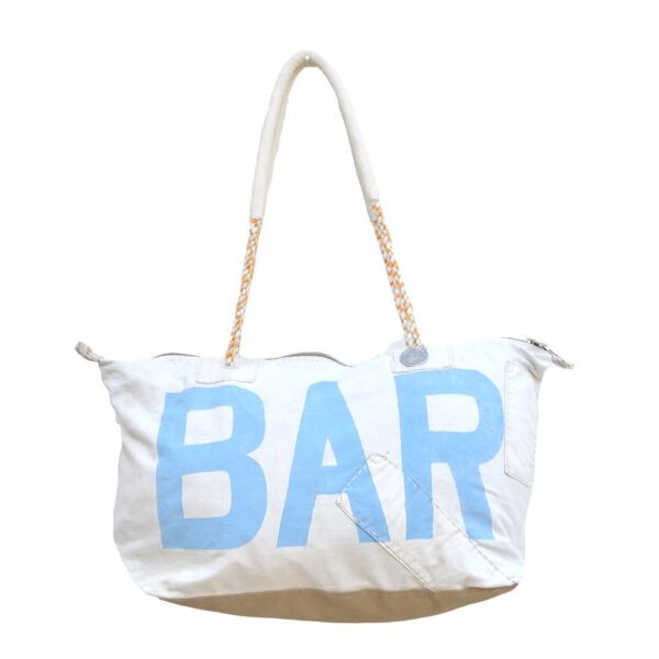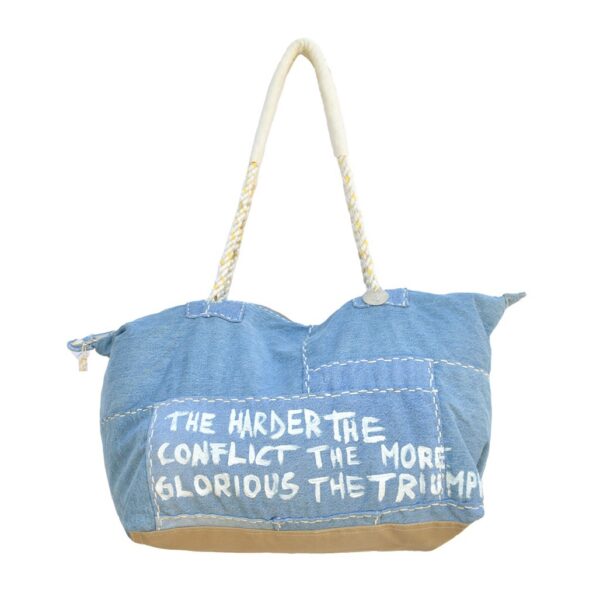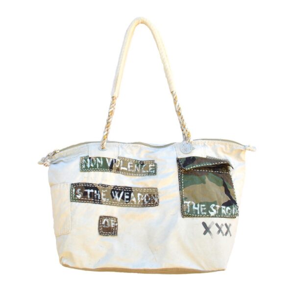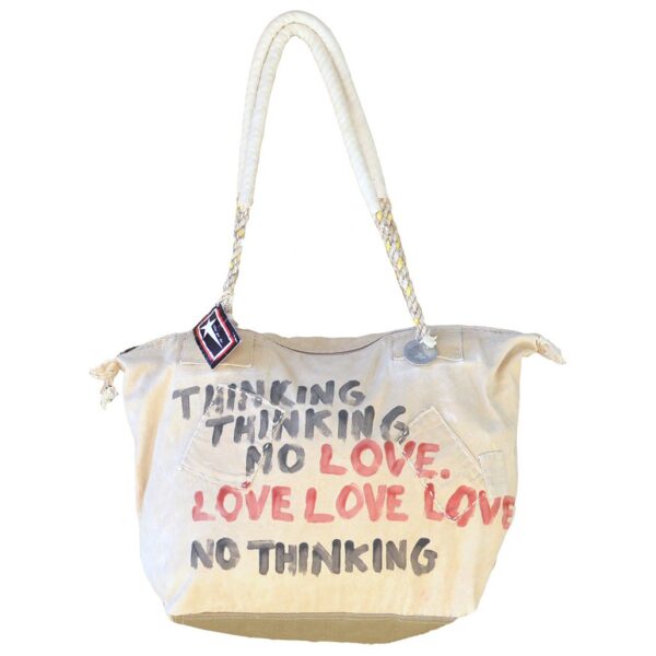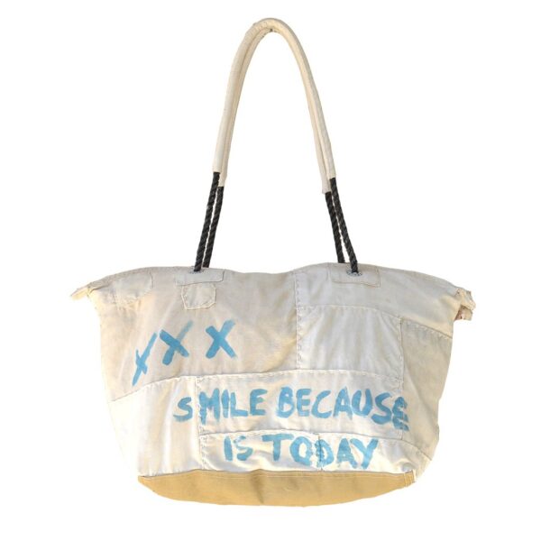 Oversized Women’s or Men’s Weekend bag. Spacious enough to pack up your travel essentials. The Large Tanga is highly durable and comfortable to carry. This beautiful piece 100% hand & heart made, is made out of 100% cotton sail-cloth . With a colourful hand painted logo. The patching of the bag can vary from the picture you see. This is what makes every bag unique. The top zip opens to a water resistant lined Interior, plus one internal zipped pocket.