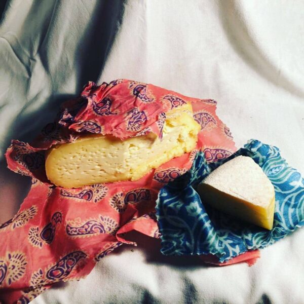 Use the warmth of your clean hands to mold the beeswax wraps over a piece of food, bowl, dish – anything you would normally cover with cligfilm or tinfoil. Stretch to cover leftovers in bowls, dips or salads. Wrap chopped veggies, sandwiches and cheese. THe wrap will hold it’s seal once it starts to cool down. It will keep your cheese, fruit, veggies, bread, baked goods and herbs. It will even keep your fermented foods such as kombucha, kefir and rising doughs nice and fresh! Not reccommended for direct use with raw meat, soft cheese or fish. Place these items in a bowl and cover, without letting the wrap touch. Don’t use with hot stuff! The wax will melt. Allow to cool first.